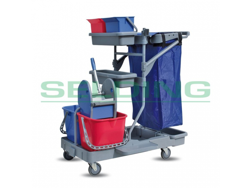 Plastmasas spaiņi zils un sarkans, tilpums 2x 15 litri. Papildus spaiņi zils un sarkans, tilpums 2x 6 litri. Atkritumu maisu turētājs 120 litru maisam (maiss nav iekļauts komplektā). Nodalījumi uzkopšanas inventāram, 2gab. Standartā ir nospiedējs kurš paredzēts plakano mopu izspiešanai. Rāmis no metāla. Izmērs: 660x1040x1350h.