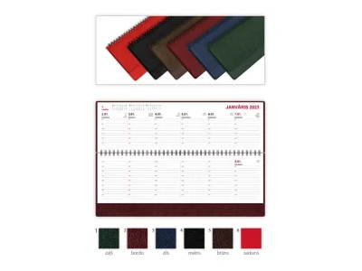 Produkta apraksts Pārliekamais galda kalendārs ar stingru PVH vāku, atvērumā - 1 nedēļa un 3 mēnešu pārskati, sastiprināts ar metāla spirāli. Satur LR svētkus, atceres un atzīmējamās dienas, vārda dienas, mēness fāzes. Ir norādīti starptautiskie un Latvijas tālsarunu kodi, pasta indeksi, noderīgi tālruņu numuri. Iekšlapas: 60 lapas. Ofseta papīrs. Druka: 2 - pusēja, melna un sarkana. Valoda: latviešu. Katra diena ar vārda dienu norādēm. Izmērs: 338 x 100mm. Produkta tehniskā specifikācija Krāsa Sarkans