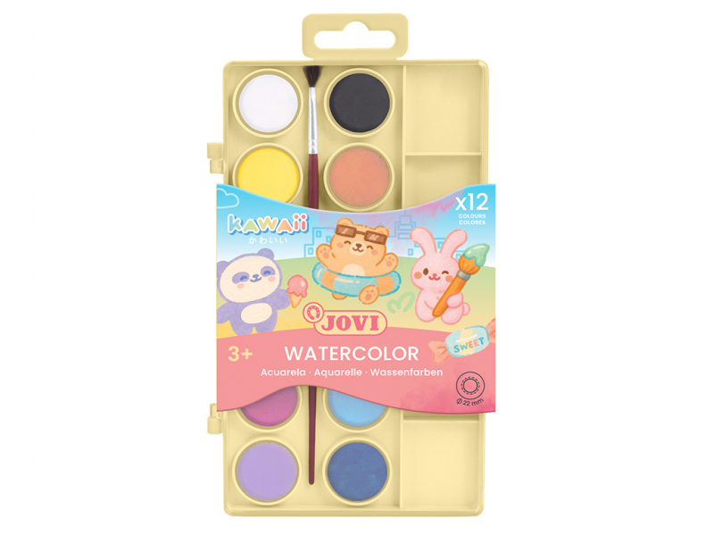 Iepazīstieties ar Jovi KAWAII akvareļu krāsu komplektu (KW800/12) – krāsainu un iedvesmojošu radošuma pasauli bērniem un pieaugušajiem! Šajā komplektā ietilpst 12 akvareļu tabletes (22 mm) un ota, kas ļauj ērti sākt gleznošanu uzreiz. Krāsas ir izteiksmīgas, viegli sajaucamas un ideāli piemērotas gan mājas lietošanai, gan skolā vai mākslas nodarbībās, nodrošinot stundām ilgu radošu prieku.