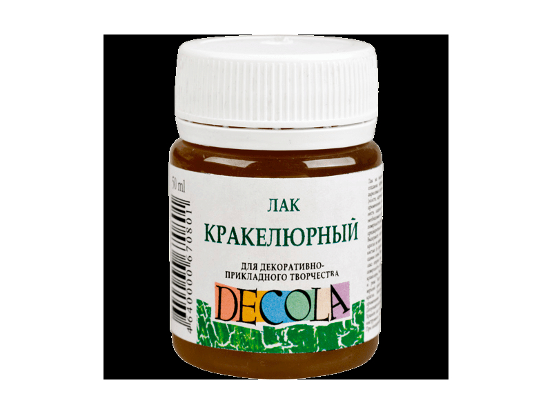 Krakelēšanas laka DECOLA ir paredzēta dekoratīvā novecošanas efekta (krakelējuma) radīšanai, izmantojot akrila krāsas. Laka ļauj viegli iegūt dekoratīvas plaisas uz virsmas, piešķirot izstrādājumiem vintage un māksliniecisku izskatu.Piemērota dažādām virsmām: audeklam, kartonam, stiklam, kokam, ādai. Ideāli piemērota dekupāžai, dekoratīvi lietišķajai mākslai, hobijiem un radošiem projektiem.Lietošanas instrukcija: