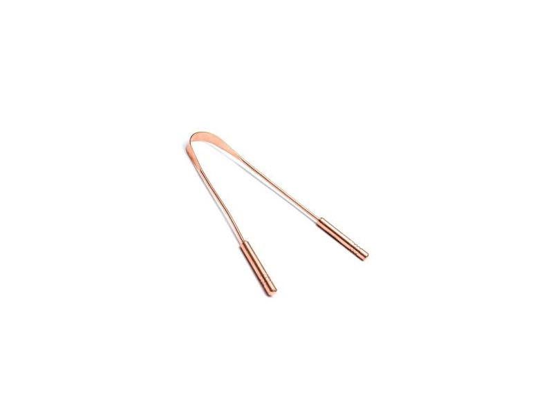 Paņemiet vara mēles skrāpi ar abām rokām aiz galiem un pagrieziet izliekto daļu pēc iespējas tālāk uz mēles sakni. Viegli velciet uz mēles priekšpusi, lai no mēles skrāpja nenokļūtu netīrumi. Atkārtojiet 3-4 reizes, pēc tam rūpīgi izskalojiet muti un noslaukiet mēles skrāpi.
