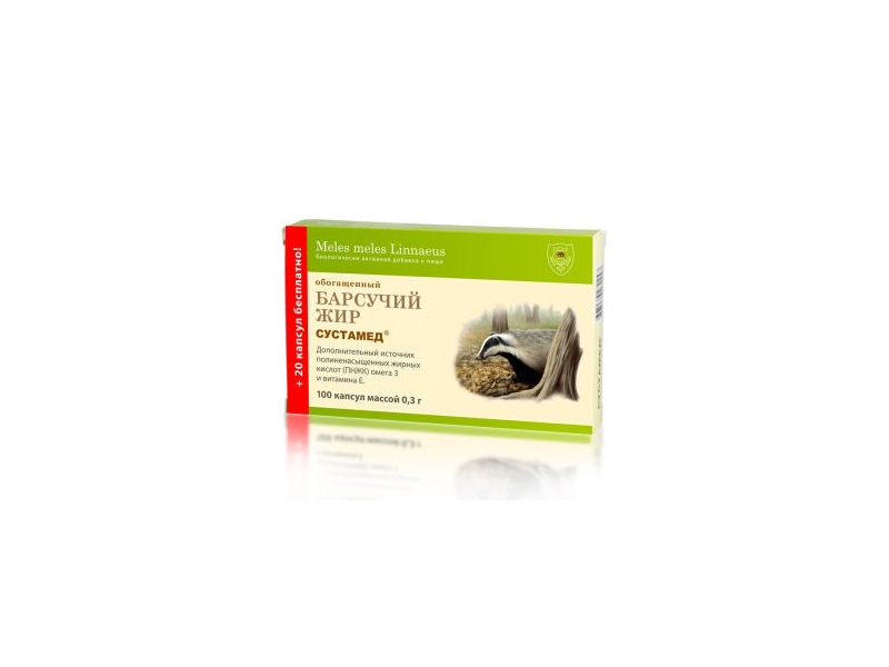“SUSTAMED” āpša tauki kapsulās — uztura bagātinātājs ērtai ikdienas polinepiesātināto taukskābju (t. sk. omega-3) un E vitamīna uzņemšanai. Formula balstīta uz kausētiem āpša taukiem un kviešu dīgstu eļļu, mīkstajās kapsulās precīzai dozēšanai. Papildu avots: PNTK un E vitamīns. Ērta lietošana: mīkstās kapsulas ikdienai. Vienkāršs sastāvs bez aromatizētājiem. Neto daudzums: 120 kapsulas Uzturvērtība (dienas deva — 24 kapsulas): Tauki — 6 g Olbaltumvielas — 0,8 g Ogļhidrāti — 0,3 mg Polinepiesātinātās taukskābes — 1,944 g Omega-3 — 0,312 g E vitamīns — 3,4 mg Enerģētiskā vērtība — 240 kJ / 60 kcal Sastāvs: Kausēti āpša tauki, kviešu dīgstu eļļa, želatīns (kapsula), konservants E211, glicerīns (mitrinātājs), ūdens. Alerģiju brīdinājums: Nelietot paaugstinātas jutības pret sastāvdaļām gadījumā (t. sk. kviešu izcelsmes produkti). Lietošanas veids: Pilngadīgajiem: pa 8 kapsulām 3 reizes dienā ēšanas laikā 1–2 mēnešus. Kursu var atkārtot 2–3 reizes gadā. Brīdinājumi: Pirms lietošanas ieteicams konsultēties ar veselības aprūpes speciālistu. Neizmantot kā pilnvērtīga uztura aizstājēju un nepārsniegt ieteicamo dienas devu. Nav ieteicams grūtniecības un zīdīšanas laikā. Alerģisku reakciju gadījumā pārtraukt lietošanu un vērsties pie ārsta. Uzglabāšana: Glabāt +5 ºC līdz +25 ºC temperatūrā, sausā, tumšā vietā, bērniem nepieejamā vietā. Derīguma termiņš: 2 gadi. Ražošanas datums: skatīt uz iepakojuma. Ražotājs: OOO “Fitosila”, Krievija.