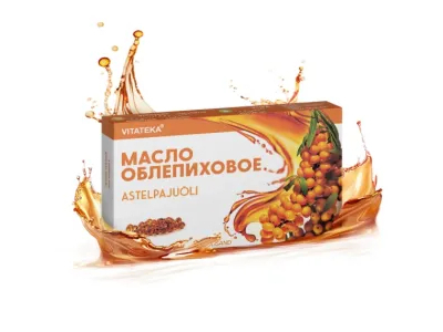 Sastāvs: Koncentrēta smiltsērkšķu eļļa, želatīna kapsula (želatīns, glicerīns, ūdens). PNT saturs ≥ 55%, mitolīnskābe ≥ 1,6%, beta-karotīns ≥ 50 mg uz 100 g produkta.