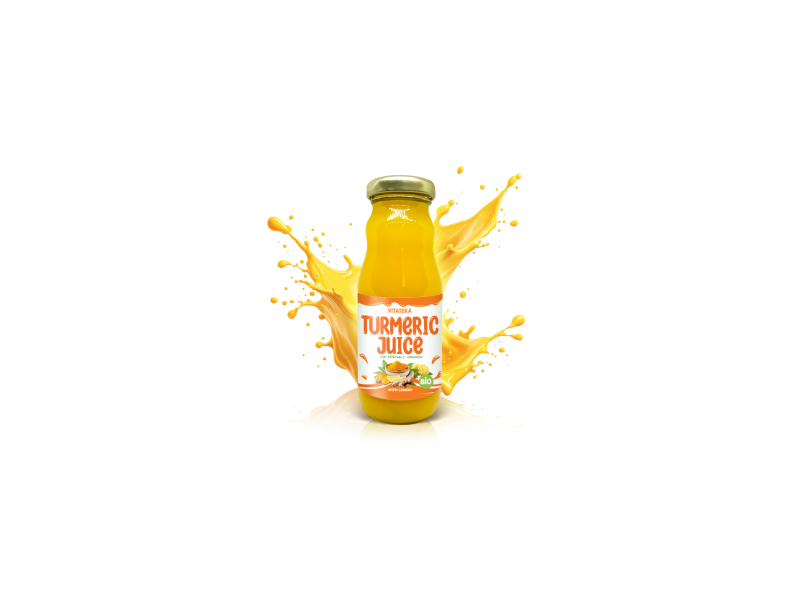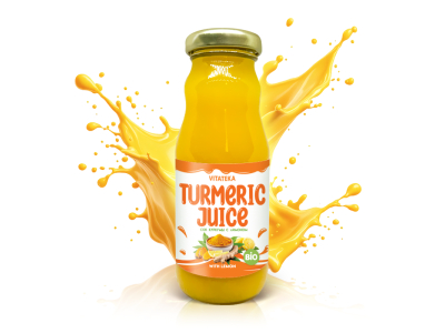 Vitateka Kurkumas sula, 200 ml — dabīgs dzēriens, kas satur kurkumas sulu (99,1%) un citronu sulas koncentrātu (0,9%). Bagāts ar antioksidantiem un uzturvielām, atbalsta imunitāti un vispārējo veselību.