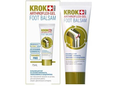 Krok Med ArthroFlex ir zāles kājas balzāms uz kaulainā zāliena, glikozamīna un hondroitīna bāzes. KROK MED ArthroFlex ir unikāla balzāma ar augstu kaulainā zāliena ekstrakta saturu 20%, glikozamīnu un hondroitīnu, uzlabo locītavu kustīgumu un elastību, muskuļu funkcionalitāti, stimulē vielmaiņas procesus un normalizē skeleta-muskuļu sistēmas darbību. To var izmantot kā sporta masāžas želeju.