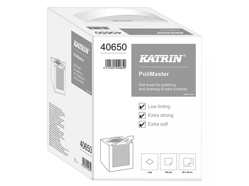 Katrin, bezpūku industriālais papīra dvielis PoliMaster cloth, 1-slāņa, 150 loksnes/kastē, 60 kastes/paletē, balts, izmērs 40x40cm