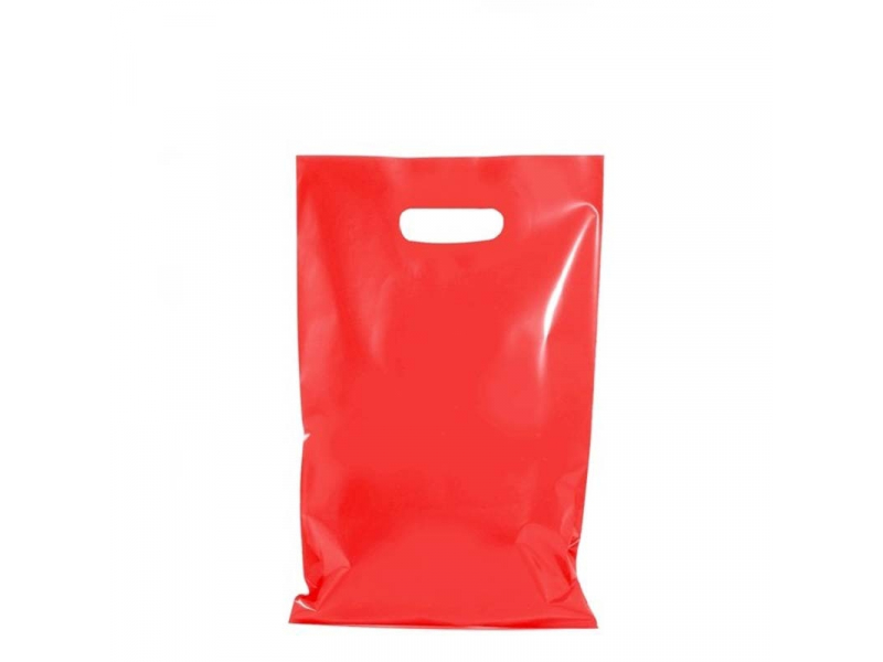 Plastmasas maisiņi ar izgrieztu rokturi, 38 x 45 + 5 cm, 50 mk, sarkani, LDPE, 100 gab. iepakojumā, 1000 gab. kastē