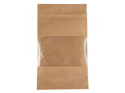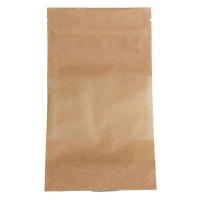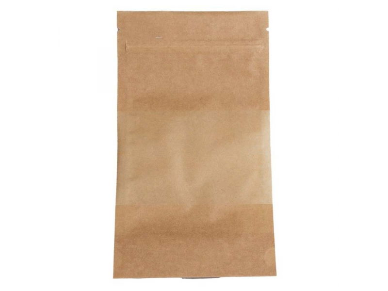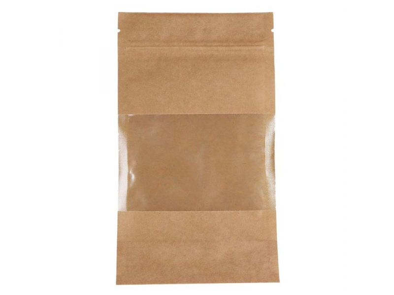 Vienreizlietojamie Doypack maisiņi, 160 x 80 x 270 mm, 750 ml, ar logu, brūni, PAP 40 mk, PET 12 mk, PE 70 mk, 100 gab. iepakojumā, 1000 gab. kastē