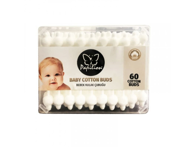 Apraksts Papilion vates kociņi Baby, 60 gab. — īpaši maigi vates kociņi zīdaiņu un bērnu higiēnai, ar drošu formu saudzīgai un precīzai kopšanai.