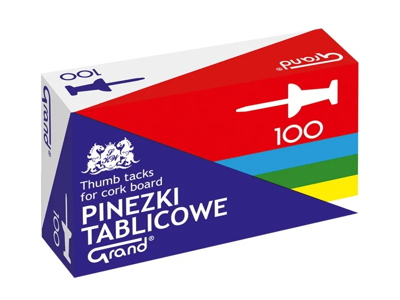 Apraksts Krāsainas tāfeles piespraudes GRAND, komplektā 100 gab. — praktisks palīglīdzeklis piezīmju, fotogrāfiju, dokumentu un shēmu piestiprināšanai pie korķa vai auduma tāfelēm. Spilgto krāsu dēļ informācija ir viegli pamanāma.