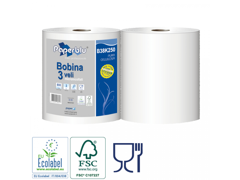 Trīsslāņu industriālais papīrs rullī, augstas kvalitātes papīra tīrīšanas materiāls, baltā krāsā.