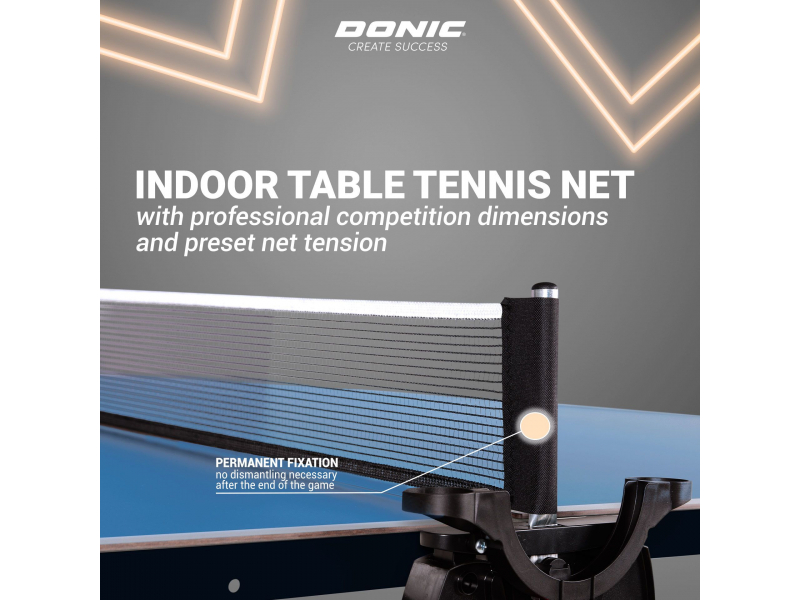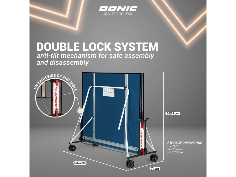 Tenisa galds lietošanai telpās. 19mm virsma garantē lielisku lielība. rāmis ir izgatavots no tērauda, 25 mm biezas caurules pārklātas ar plastmasu. dubultie 125 mm riteņi. droša bloķēšanas sistēma ar rokturi; pievienots koordinātu tīkls; paplāte raketes un bumbas; izmēri salocīta galda : 155 x 74 x 165 cm spēles virsmas izmēri : 274 x 152,5 x 76 cm var spēlēt ar vienu spēlētāju, locot tabulu uz pusēm. atbilst saskaņotajiem Eiropas drošības standartiem en 14468 svars : 63 kg