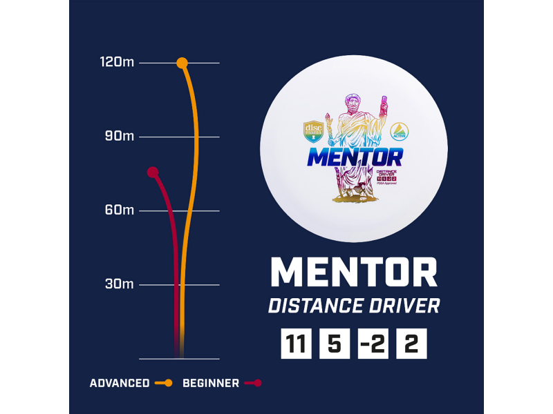 Mentor bija paredzēts distances optimizēšanai spēlētāji var iegūt, apvienojot ātru pagriezienu un lēna ātruma stabilitāti. izturīgs plastmasas savienojums nodrošina lielisku saķeri visos laika apstākļos. visi aktīvo līniju diskdziņi ir 165-170 grami. disku numuri : 11 i 5 i - 2 i 2 diska drukas krāsa var atšķirties no attēla.