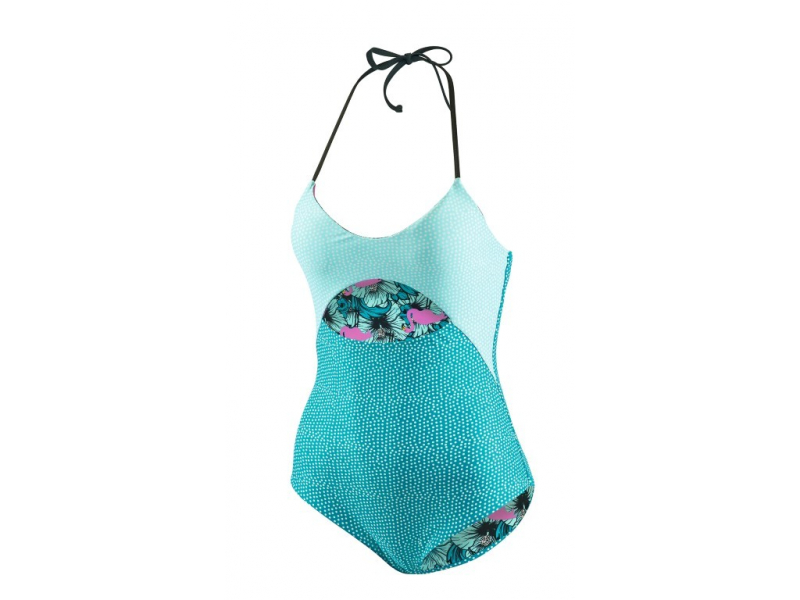 Beco stilīgs, ciets reversīvs dubultslānis, šaura kakla siksna, peldkostīms. vienu pusi rotā flamingi, otru — mazi punktiņi. piešūti - mīkstās tases. sastāvs : 80% poliamīds, 20% elastāns. krāsa : tirkīzs / rozā
