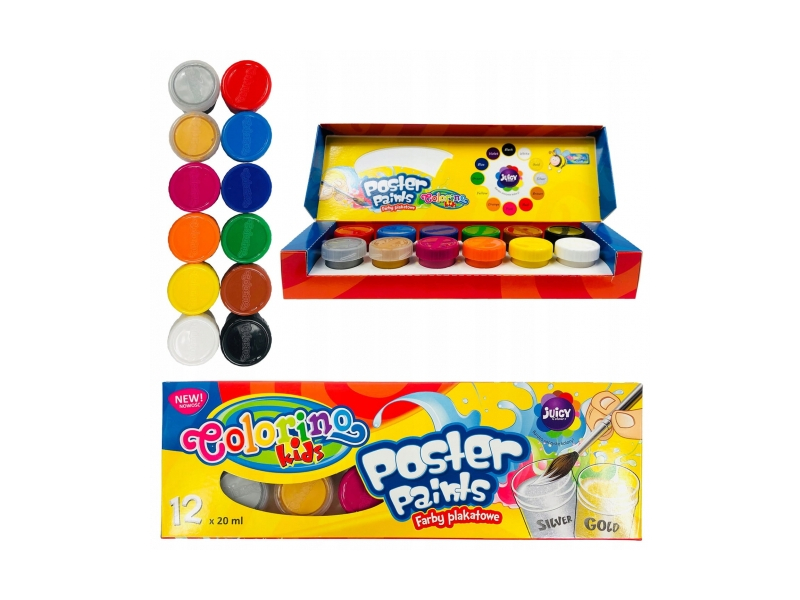 Perfectly covering water-soluble paints in 12 basic krāsas. Thanks to their velvety consistency, the paints spread perfectly on the painted surface. The krāsas can be easily mixed, which makes it possible to extend the available palette of krāsas.They are suigalds for painting on various surfaces, such as: paper, cardboard, wood, ceramics.Non-toxic.They have the necessary attestations and certificates.
