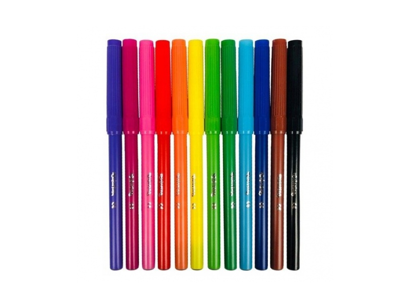 Classic markers with a thin 2mm tip, 12 in set. Ideal for drawing precise shapes or writing. Packaged in plastic tube with handle for easy storage and carrying. High quality plastic, vented cap, washable ink.