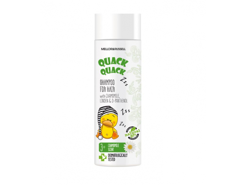 QUACK QUACK Šampūns matiem ar kumelītēm un liepziediem, bagātināts ar D-pantenolu. Rezultāts ir attīrīti un mīksti mati ar patīkamu kliņģerīšu aromātu. Kumelīte - antiseptiskas īpašības. Liepa - mīkstina un mitrina matus.