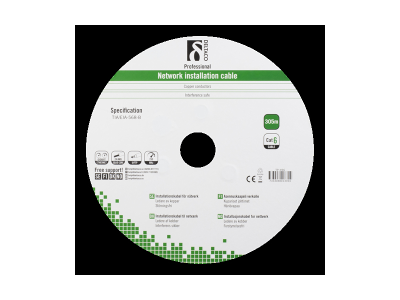 DELTACO F / UTP Cat6 uzstādīšanas kabelis, izmantošanai ārpus telpām, 305m cilindrs, 250MHz, Delta sertificēts, meln