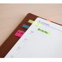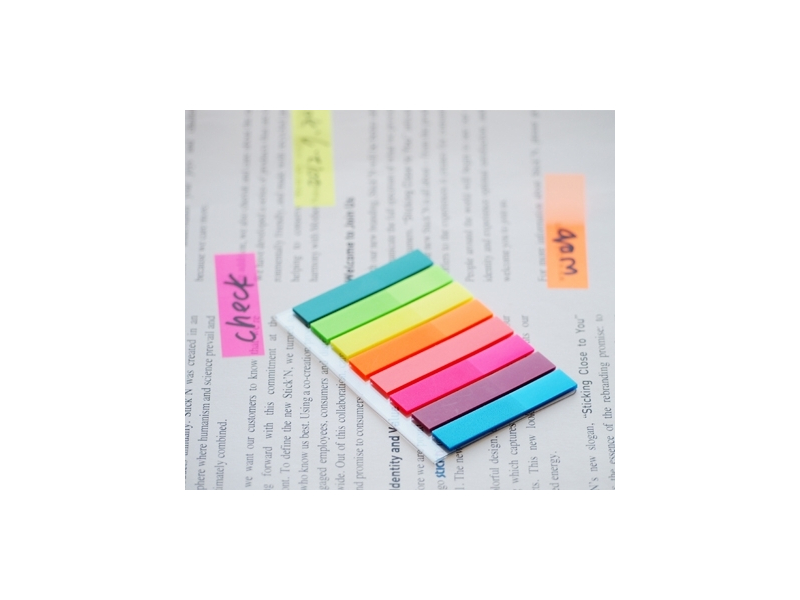 Izgatavotas no izturīgas, caurspīdīgas plastmasas, šīs mazās grāmatzīmes ir 45 x 8 mm lielas un pieejamas spilgtā 8 neona krāsu asortimentā. To galvenā priekšrocība ir spēja tikt atkārtoti izmantotām neskaitāmas reizes, neatstājot nekādas pēdas un nodrošinot skaidru teksta redzamību zem tām. Šī ekonomiskā un ilgmūžīgā alternatīva palīdz samazināt papīra atkritumus, padarot to par ideālu izvēli videi draudzīgiem lietotājiem.
