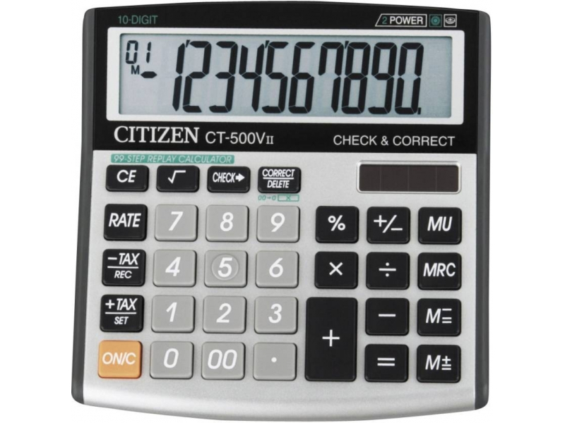 Citizen CT-500V II galda kalkulators ir izturīgs un uzticams risinājums jūsu ikdienas aprēķiniem. Ar skaidru 10-ciparu LCD displeju šis kalkulators ir ideāli piemērots dažādām vidēm, sākot no rosīgiem birojiem un mājas darbstacijām līdz studentu galdiem, piedāvājot stabilu veiktspēju visos skaitliskajos uzdevumos.