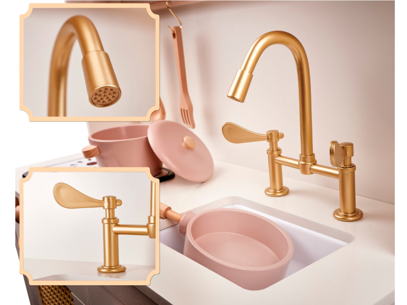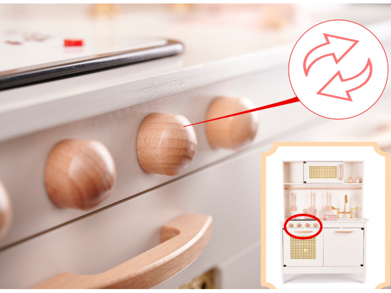 Virtuve ir ļoti regulējama, tā lieliski noderēs kā aksesuārs bērnu istabā vai rotaļu istabā. Tas priecē ar savu estētiku!