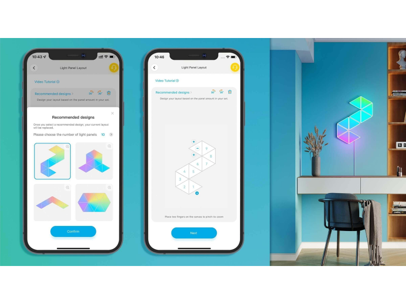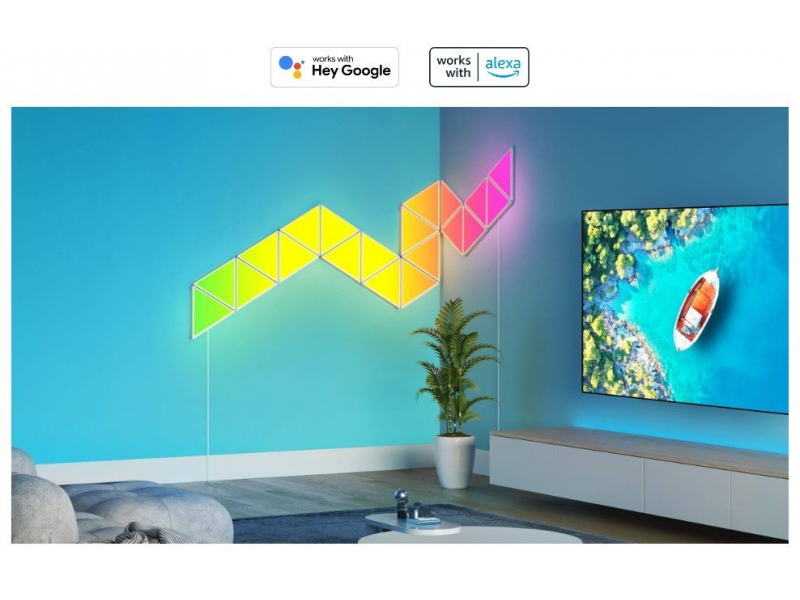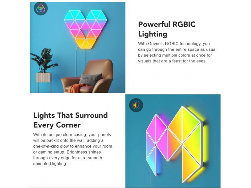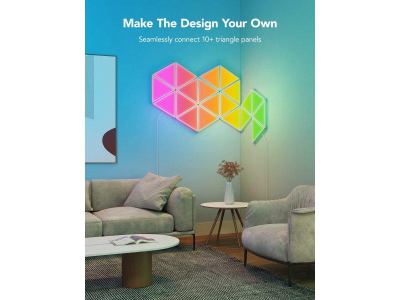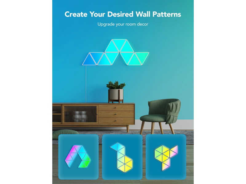 Piešķiriet mirdzumu jūsu mājas dekoram ar šiem trīsstūrveida gaismas paneļiem. Katrs panelis rada acīm patīkamus efektus, izmantojot RGBIC tehnoloģiju, mūzikas režīmus, DIY režīmu un daudz ko citu