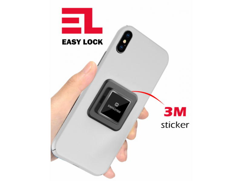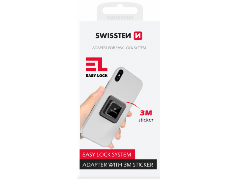 Adapteris ir universāla līmējošā plāksne viedtālruņa piestiprināšanai pie SWISSTEN EASY LOCK produktiem.