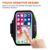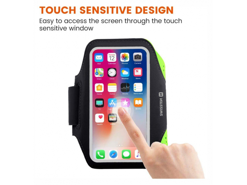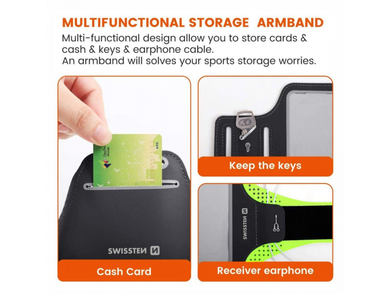 SWISSTEN ARMBAND ir viegls sporta maciņš jūsu viedtālrunim ar atveri austiņu ligzdai, atstarojošiem elementiem un atslēgu kabatu. Iepakots SWISSTEN mazumtirdzniecības iepakojumā.