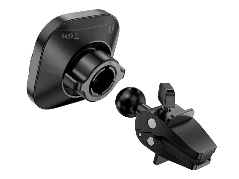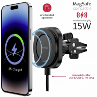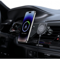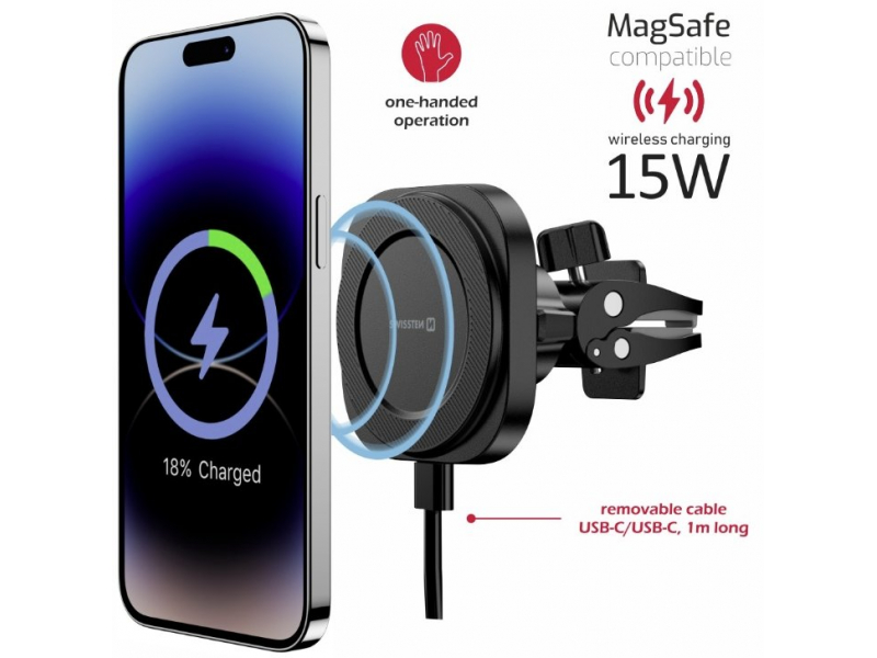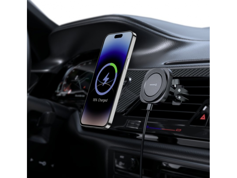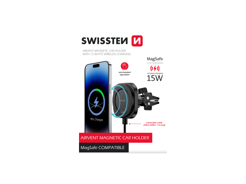 Swissten magnētiskais turētājs ventilācijas režģī ar MagSafe saderīgu bezvadu uzlādi ar lielu 15 W jaudu un noņemamu kabeli.Bezvadu uzlāde ar MagSafe lādētāju ir ļoti vienkārša. Perfekti novietoti magnēti nofiksējas Iphone 12 un jaunāku sēriju uzlādes virsmas centrā. Viedtālruņus var bezvadu režīmā uzlādēt līdz 15 vatiem. MagSafe turētājs saglabā saderību ar Qi uzlādi, tāpēc to var izmantot, lai bezvadu režīmā uzlādētu iPhone 8 un jaunākus modeļus.