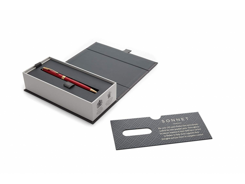 Radīta patiesi izsmalcinātai sajūtai, šī augstākās klases lodīšu pildspalva izceļas ar košu sarkanu lakotu apdari, ko izsmalcināti papildina smalkas zeltītas detaļas. Katra Sonnet pildspalva ir rūpīgi salikta ar rokām, nodrošinot nevainojamu darbību un ilgstošu izturību. Izbaudiet pastāvīgi gludu un precīzu rakstīšanu, kas ir ideāla piezīmēm, vēstulēm vai svarīgiem dokumentiem.
