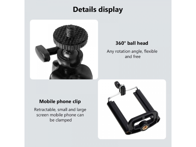 Iekārtas stiprinājums: Universāls iekārtas stiprinājums ar savelkamu fiksātora tehnoloģiju, kas ļaus iestiprināt gan Telefonu, gan foto kameru.