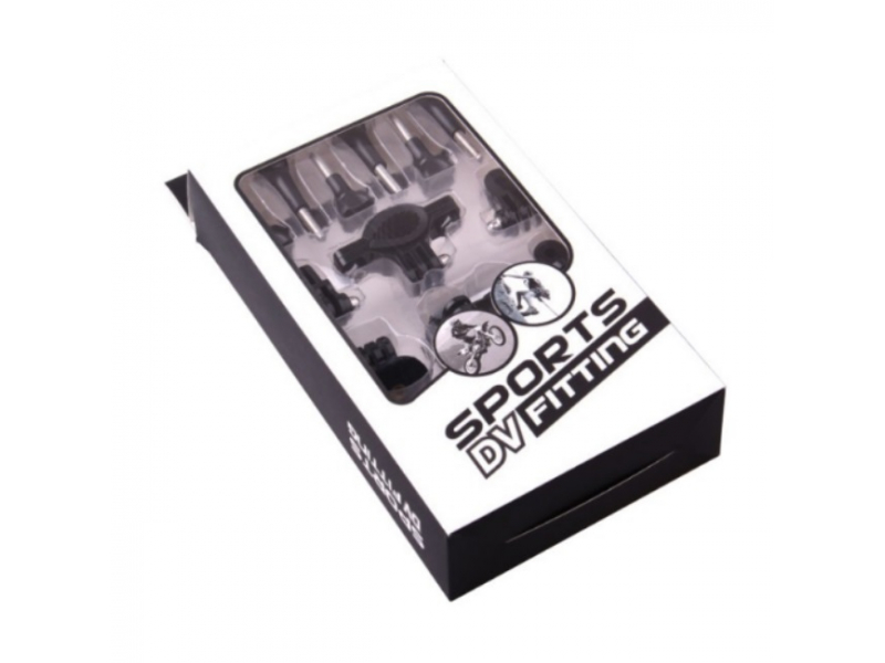 Universāls sporta kameru stiprinājumu komplekts kas sastāv no 22mm vītņu skrūvēm, divpusējiem līmlentes elementiem, 1/4" adapteriem dažādos leņķos, un sažādu leņķu savilcējiem un fiksātoriem.