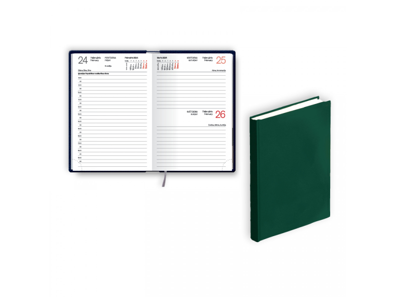 Zaļais A6 plānotājs izceļas ar kvalitatīvu FSC sertificētu papīru, kas apliecina atbildīgu mežu apsaimniekošanu, un izturīgiem, nepolsterētiem balacron vākiem. Praktiskas detaļas, piemēram, stūru perforācija un ērta grāmatzīme, nodrošina ātru piekļuvi aktuālajai dienai. Muguriņā iespiests gadskaitlis piešķir papildu eleganci, bet pēclapā esošā Latvijas karte ir noderīgs bonuss. Ar izmēru 98x150mm šis dienas organizators ērti iekļausies somā vai portfelī.