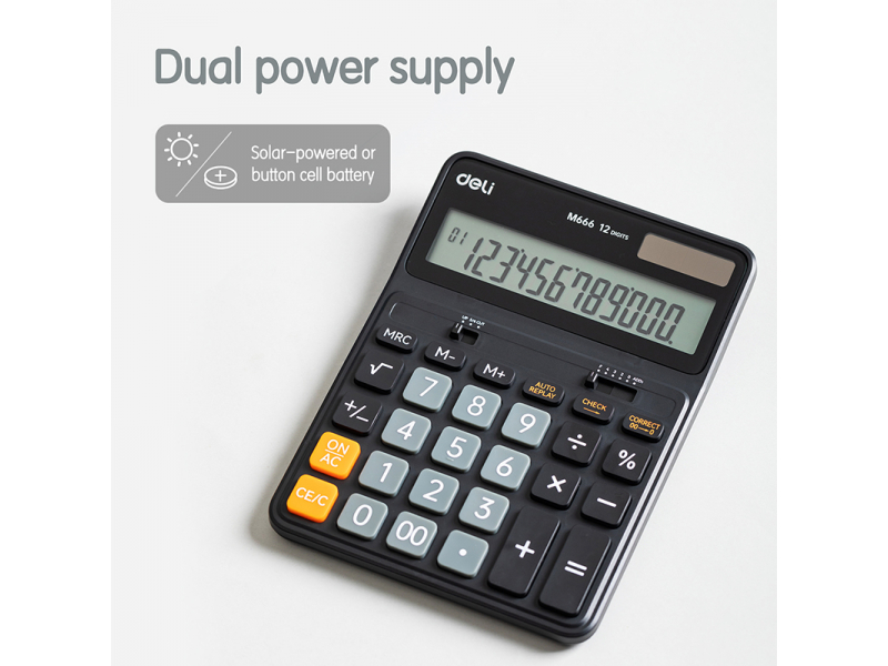 Meklējat uzticamu galda kalkulatoru ikdienas aprēķiniem? DELI M666 ir lieliska izvēle studentiem, profesionāļiem un ikvienam, kam nepieciešami ātri un precīzi aprēķini. Šis 12 ciparu kalkulators ir aprīkots ar daudzpusīgu dubulto barošanas sistēmu – tas darbojas gan ar bateriju, gan ar saules enerģiju, nodrošinot nevainojamu veiktspēju jebkuros apgaismojuma apstākļos. Tas ir ideāls palīgs skolā, birojā vai mājās.