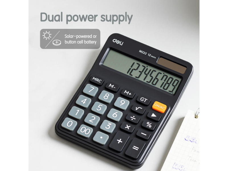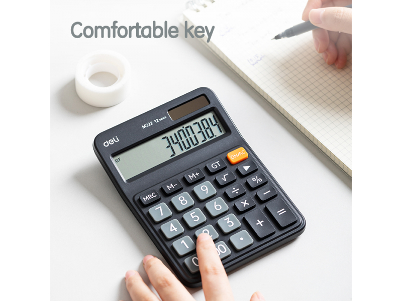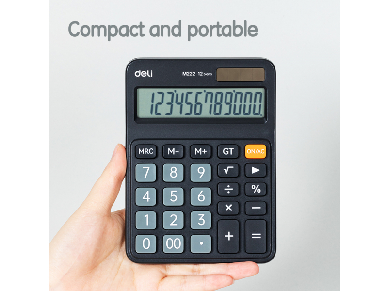 Pateicoties kompaktajam izmēram, šis galda kalkulators neaizņems daudz vietas uz darba galda un viegli ietilps somā. Ergonomiskais dizains un divkāršā barošana (no saules baterijas un standarta baterijas, kas iekļauta komplektā) nodrošina komfortu un nepārtrauktu darbību jebkuros apstākļos. DELI M222 ir izdevīga cenas un kvalitātes kombinācija, piedāvājot visas nepieciešamās funkcijas efektīviem ikdienas aprēķiniem.