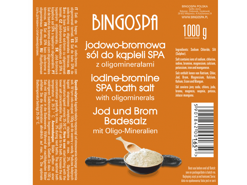 Joda-broma sāls BINGOSPA satur dabīgus minerālus, kas labvēlīgi ietekmē mūsu ķermeni. Peldēšanās joda-broma sālī ar termiskajiem oligominerāliem aizsargā, baro un atjauno ādu. Atslābina un relaksē.